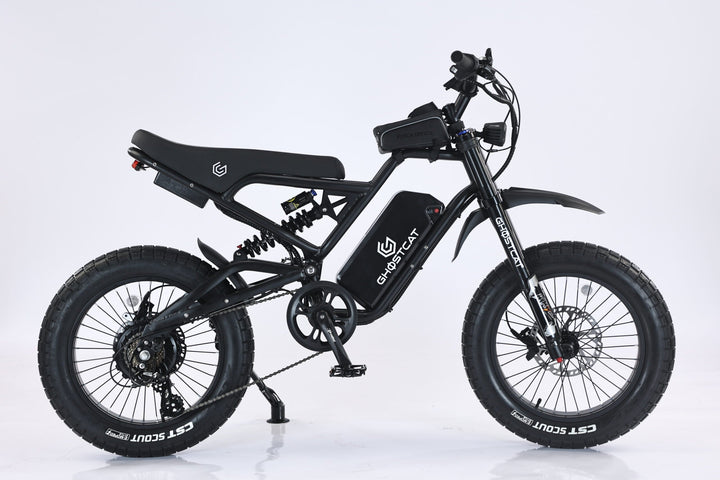 The GhostCat F3X.2 1500W PRO represents the 3rd generation of our high-performance, fat tire electric bikes, crafted to deliver lightweight motorcycle-style thrills. With upgraded suspension, battery, and motor components, this dual-sport ride is built for adventure.