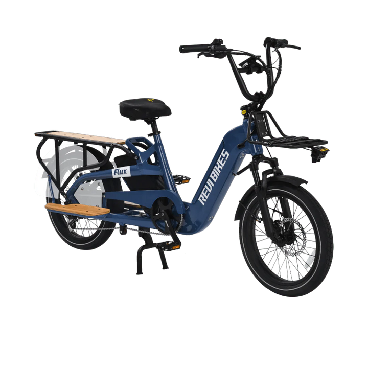 The REVI Flux Step Thru eBike is a Fat Tire electric bike with a powerful 750w motor and a long distance 48v 15ah battery. With 20 inch Fat Tires, 7 Speed's and Hydraulic brakes this Mini Fat Tire Electric Cargo eBike ebike is a Class 2-3, with a top speed up to 25 mph. An optimal distance of 55 - 120 and charge time of 4 - 6 hrs. This REVI Flux Step Thru electric bike is 99lbs with a maximum cargo weight of 440lbs. The REVI Flux comes in the following colors: Navy,Nebula,Grey,Cream.